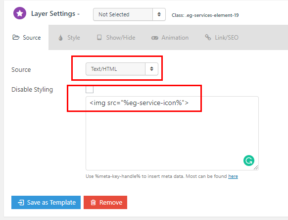 After setting up a custom meta called ‘eg-service-image’ set as an image, I selected an image for one of the posts and what I’m getting is the URL showing in the grid item instead of the image (I’ve blurred the first part of the URL in the image). The image is a PNG, but I get the same results with a JPG.