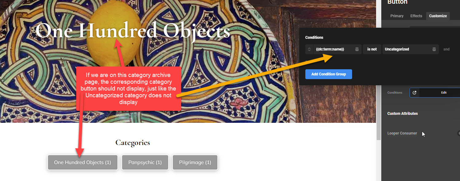 In Conditions, I have set {{dc:term:name}} is not Uncategorized to make sure the Uncategorized category does not display. However, I am trying to also remove the category whose page the visitor is currently on. For example, if we have the categories “Psychology” “Medical” and “Holistic”, if we are on the “Holistic” category archive only the buttons for “Psychology” and “Medical” display.