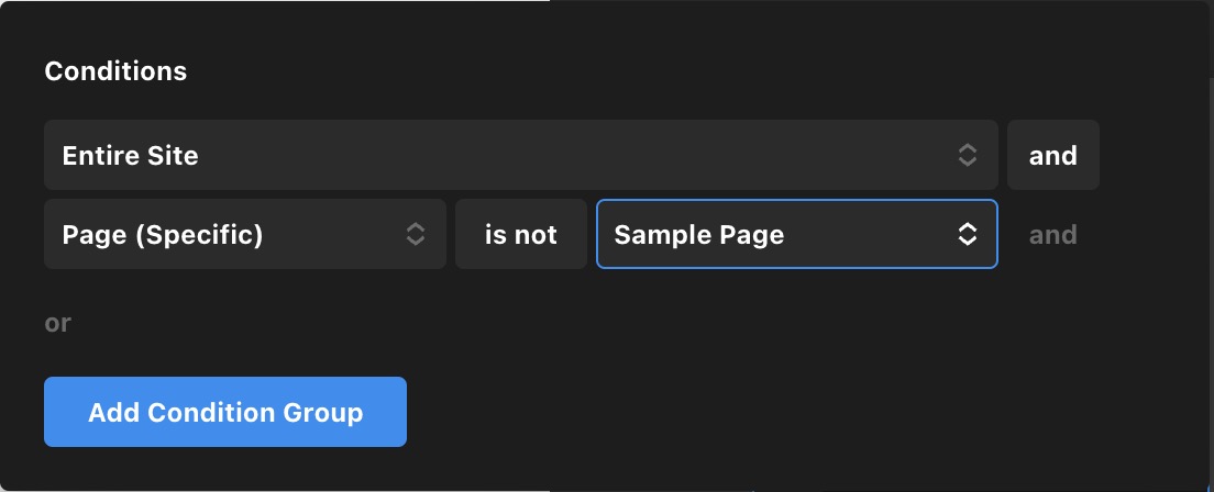 I created a footer and found where you can add conditions of which places to include the footer. I want it to show on the “entire site” except one page. Is there a way to do that without including every page manually? Or just use css to not display the footer on that page?