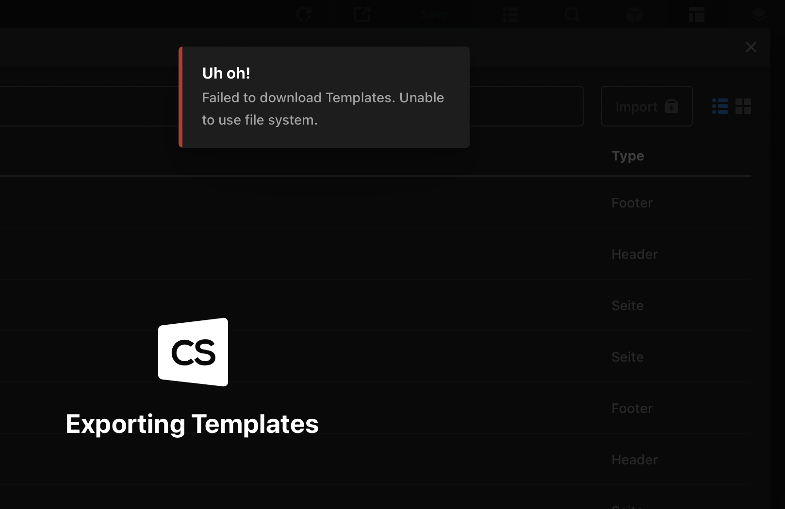 I am having trouble downloading pages, elements or components. An error message appears each time I am trying to download saying ‘Uh no. Failed to download Templates. Unable to use file system.’