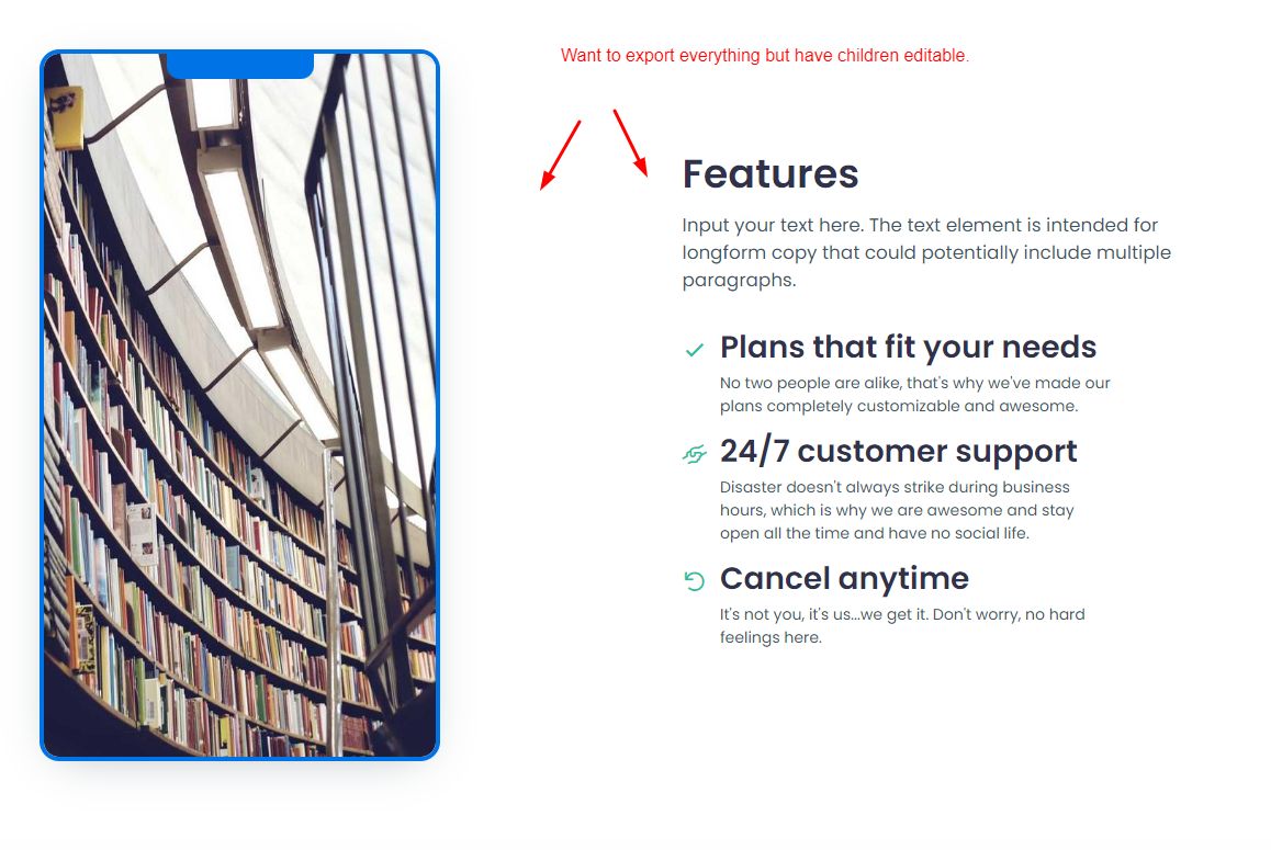 Is it possible to export something like a row as a component and have its children editable when put on a page?