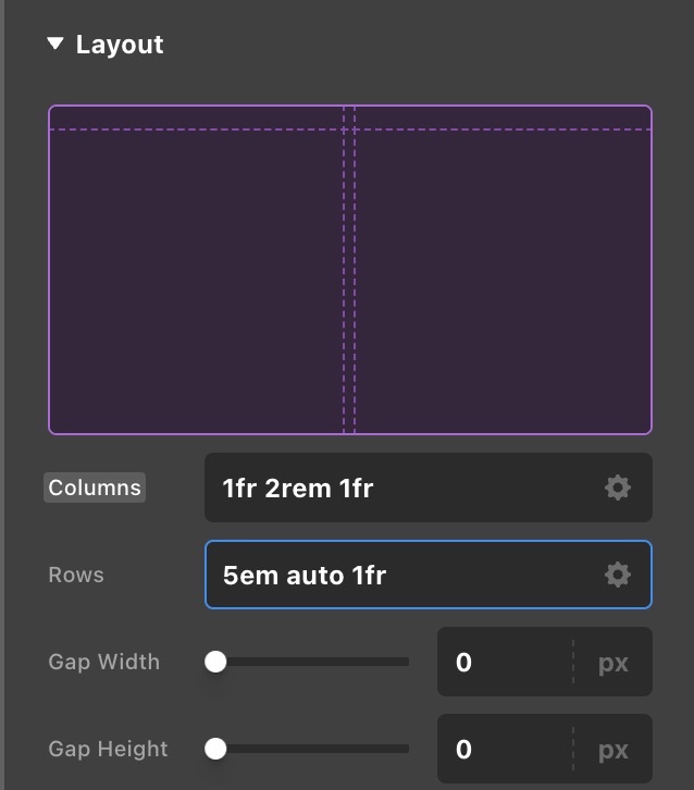For the grid, I have the grid set to ‘columns: 1fr 2rem 1fr | rows: 5em 1fr 1fr’