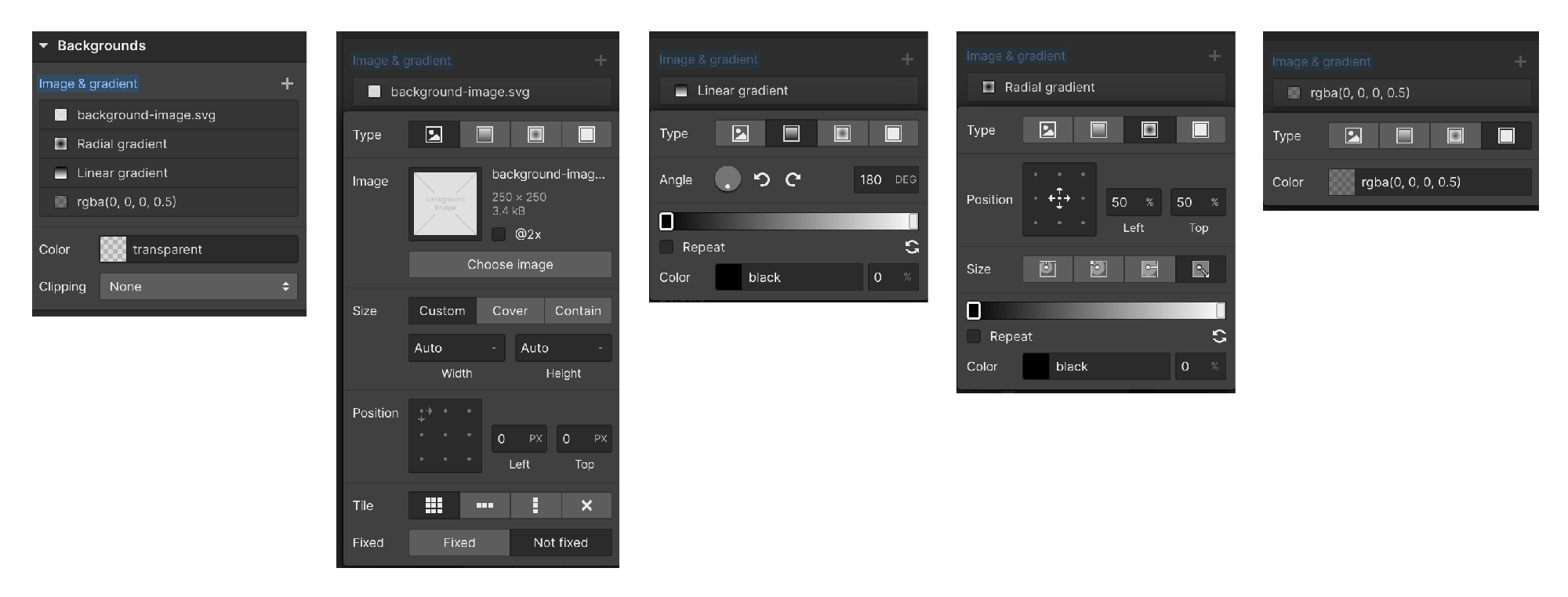 You need to seriously rework the background setting functionality and make it possible to set any number of backgrounds as layers you want, so that each layer can be an image, a color, or a gradient of a different type. All modern browsers support all gradients 2 versions backwards (use caniuse.com).