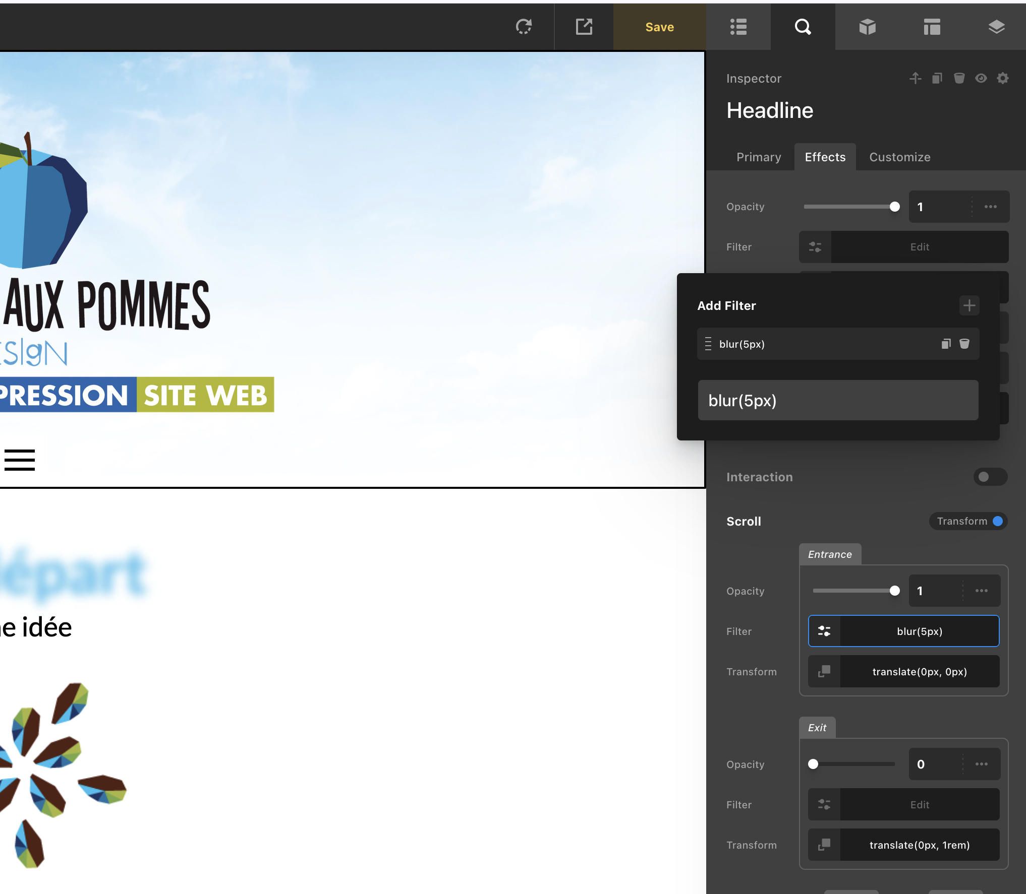 The default is Blur for Filter and Translate for the Transform effect. Click on the item and then the selection displays as shown in the screenshots below.