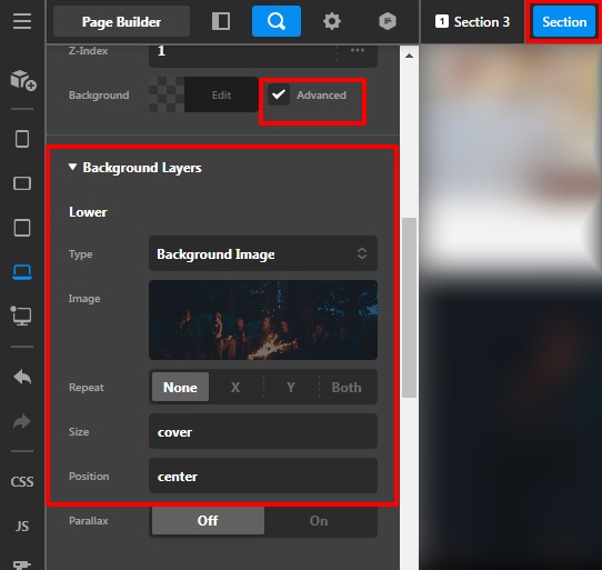 - Go to your page—>Section —>Advanced —>Backgoround layer set the background image in the Lower layer.