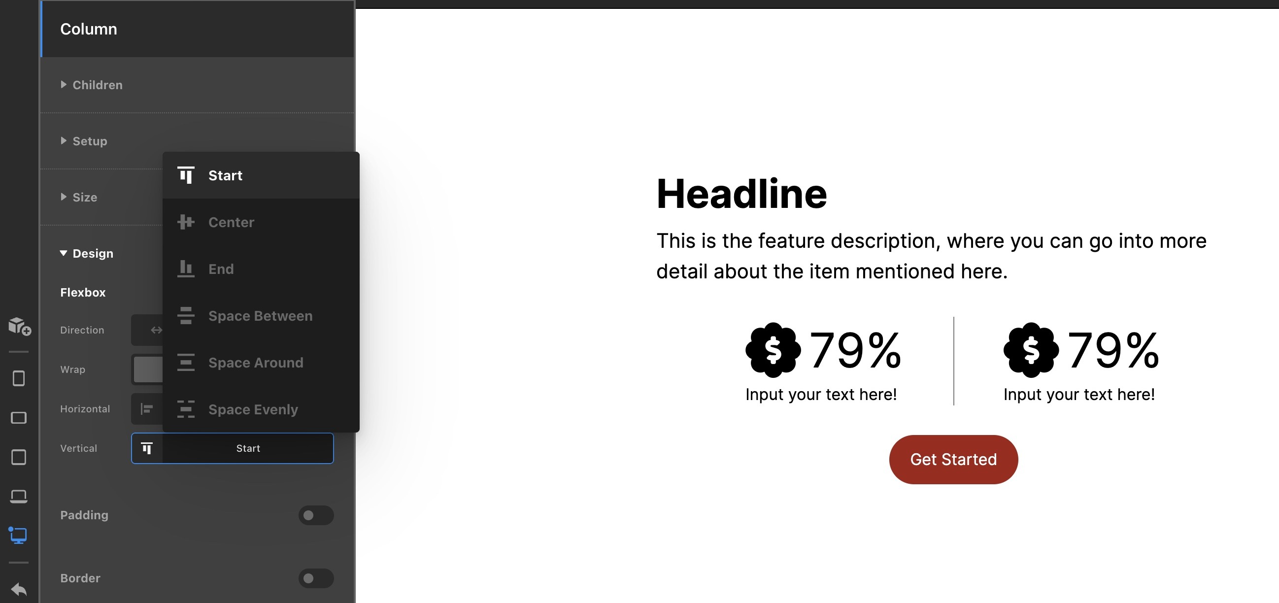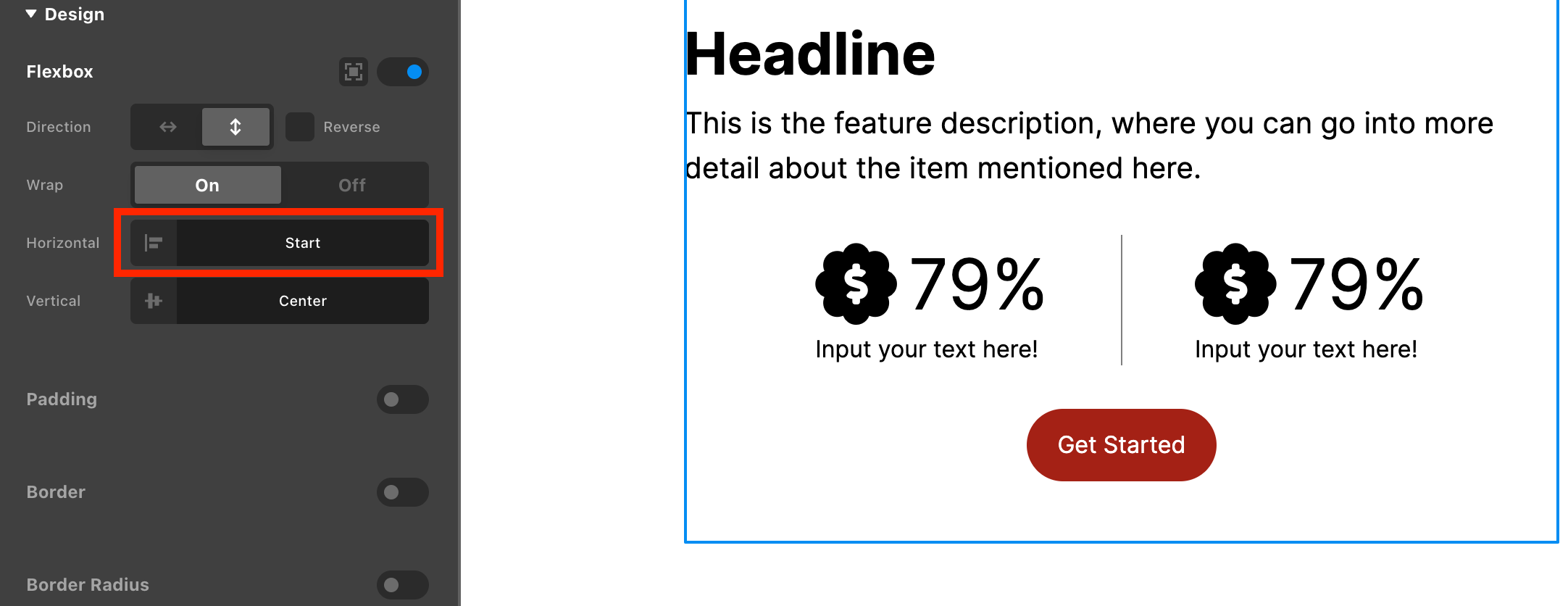 I’m having issues getting all content within a column to horizontally align to “start” (left) using the flexbox settings. Can you please take a look and let me know if there’s a way to fix this?