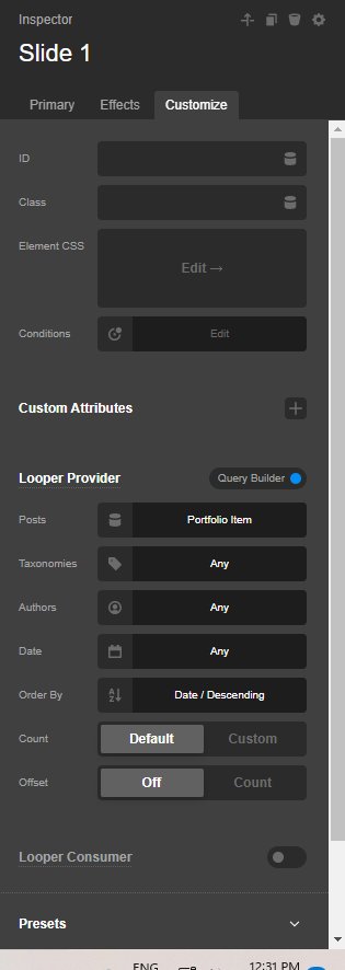 ok I have set the slider to query builder and selected portfolio and specifically set the portfolio to one that I have created