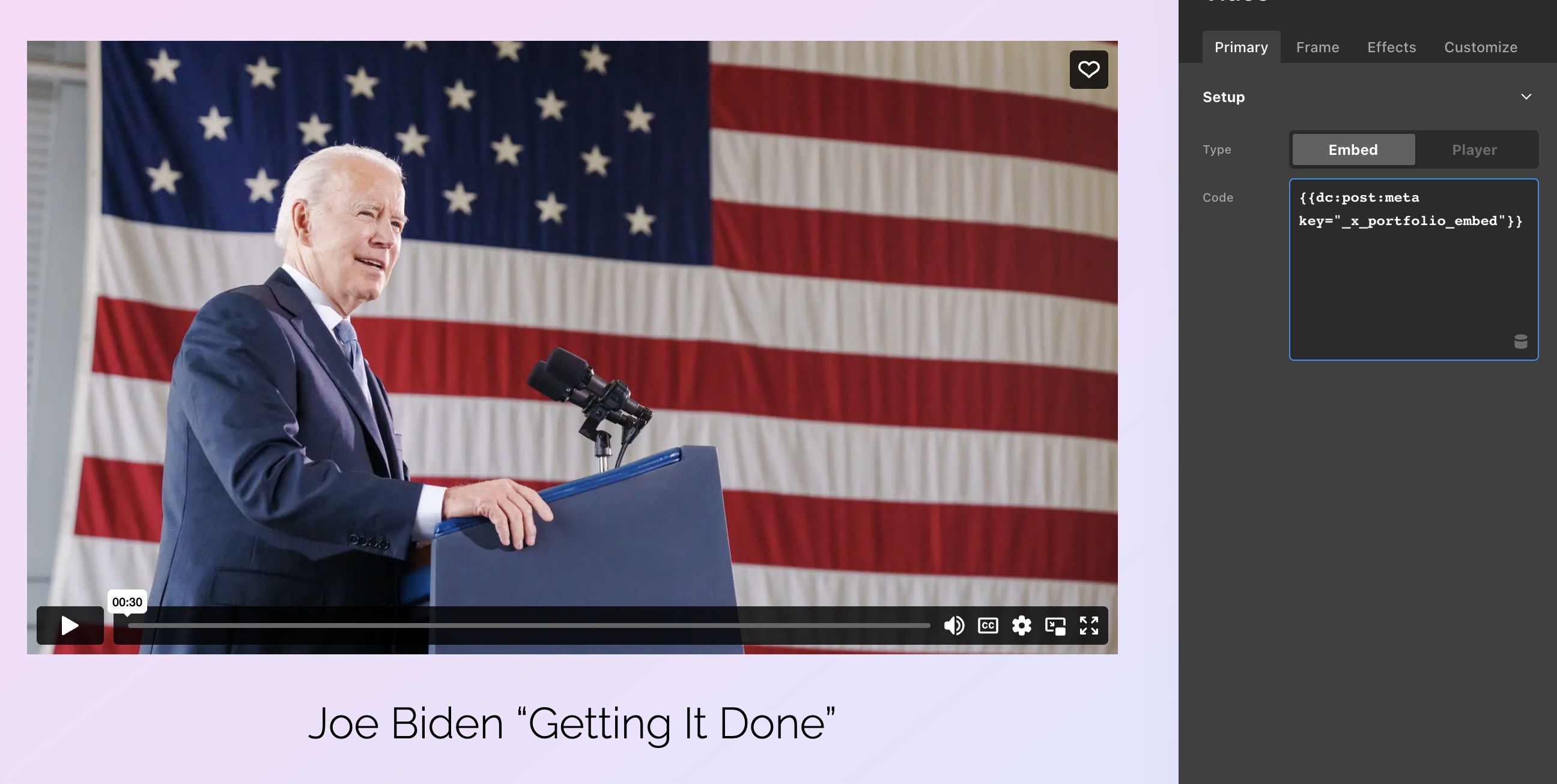 I’m trying to build a custom portfolio single template using Layout Builder, but I’m having problems pulling the video embed code that I’ve entered under Video Portfolio Item Settings.