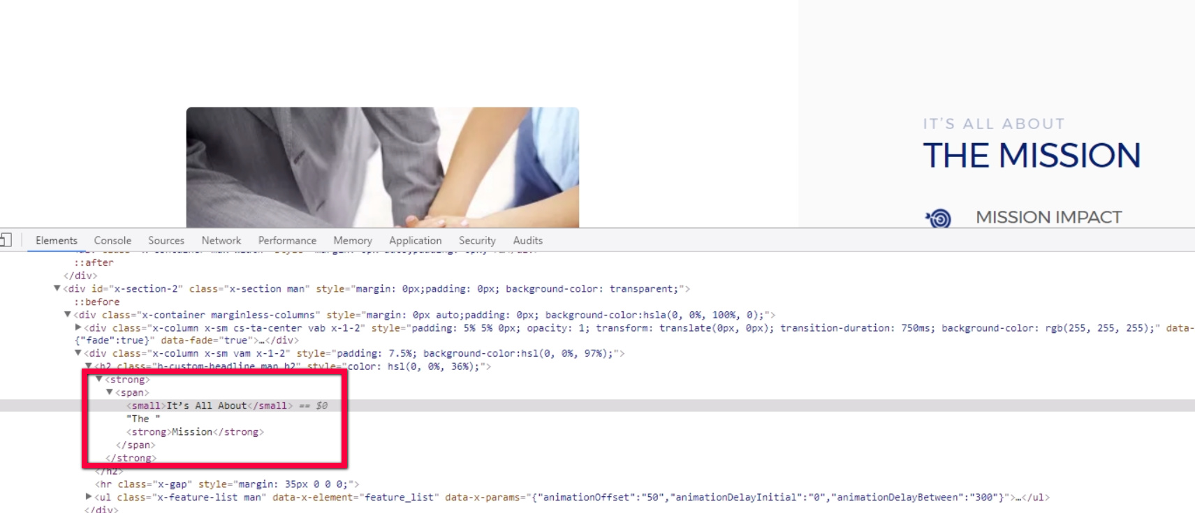 The Its all about the mission headline is wrapped in a strong tag and the CSS mentioned above gets more precedence that the color that is set the in outer heading element.