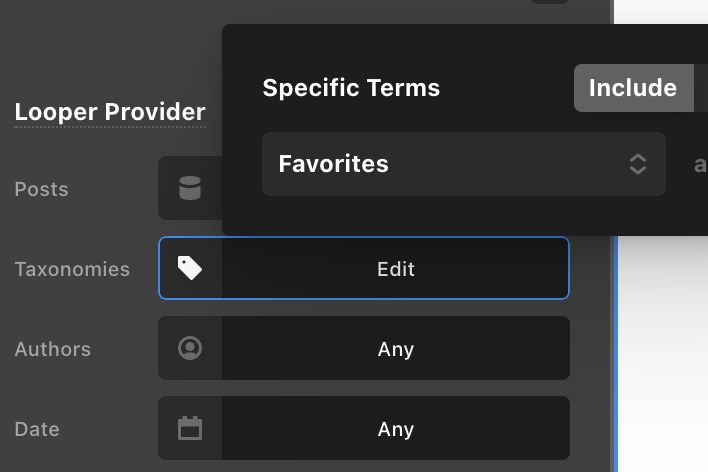 You can make use of the Posts element. By changing the Looper Provider of the Post element from “Recent Posts” to “Query Builder”, you can then select the post items that were hand-picked or has the “Favorites” category.