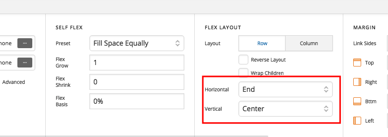 Please make sure that the horizontal flex layout of the container is set to End and the vertical flex layout of the container is set to Center.