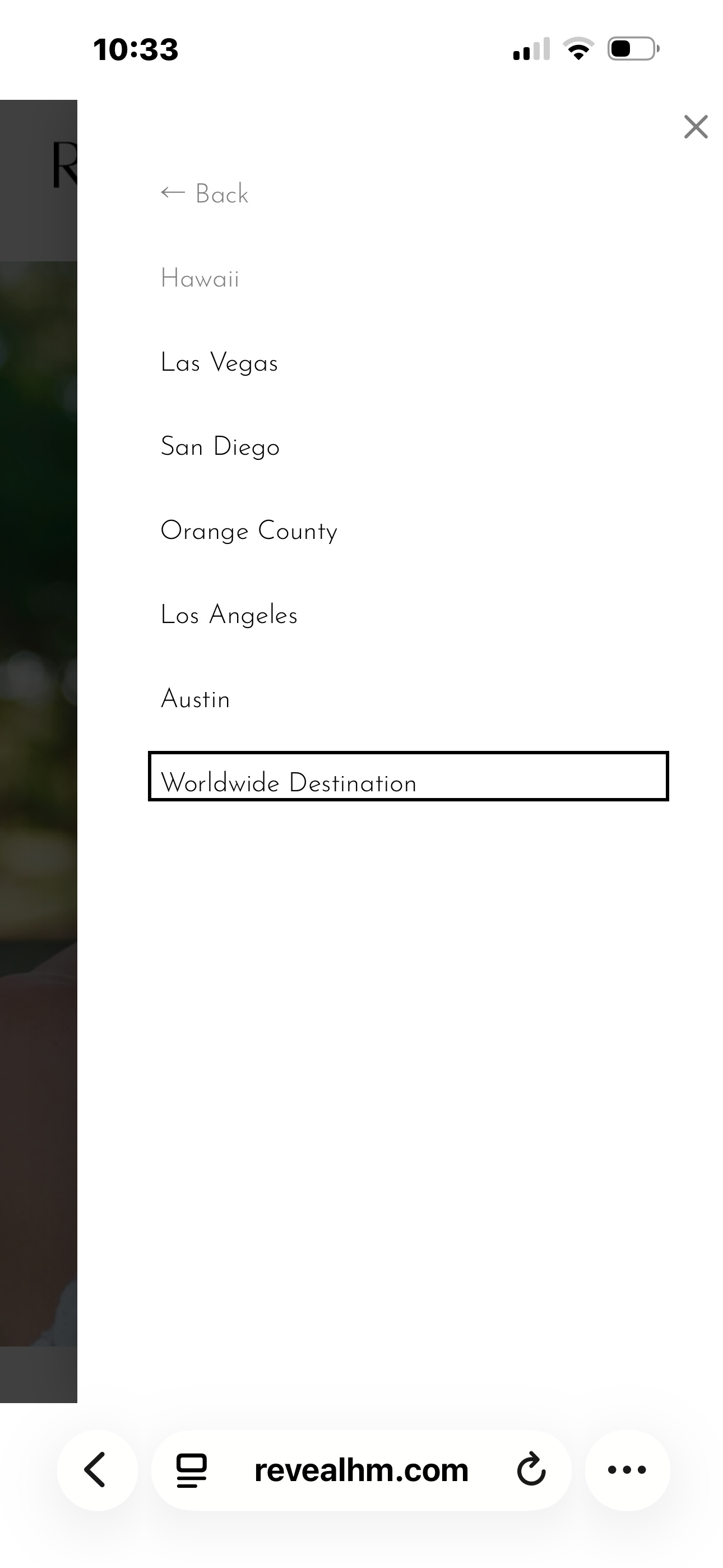 The screenshot is. attached to the link above. The mobile menu is shown. I have also shared the URL from mobile. https://revealhm.com/hawaii/ you’ll need to. hit the 3 bar menu to. see the menu.