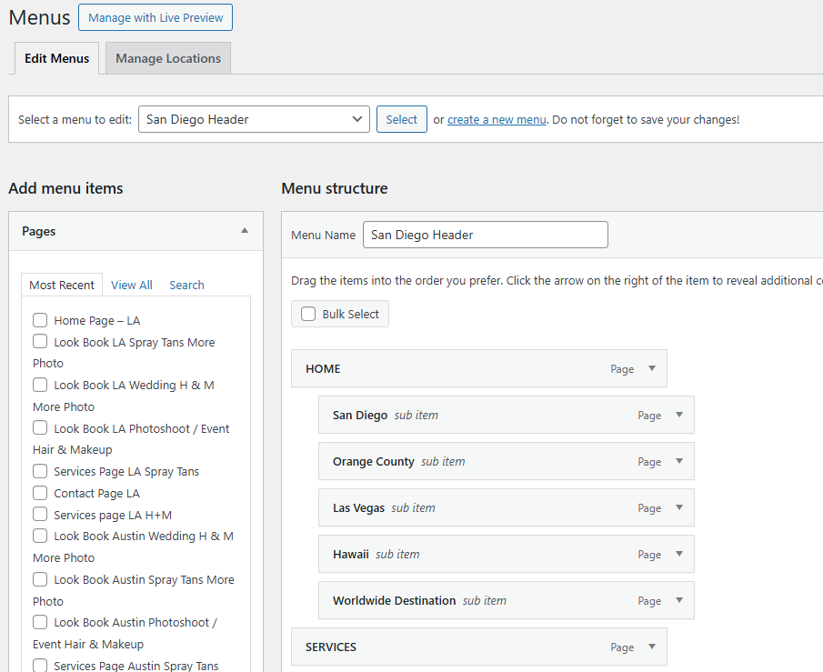 I added a new header menu called LA Menu. However, every time I try to make “services” or Look book become a head menu and I remove it from under the other section every time I save the menu is reverts back to everything under the home page. I want to get this done and figured out as it is the LAST step in our website new location addition. Please help me get this mobile version figured out.