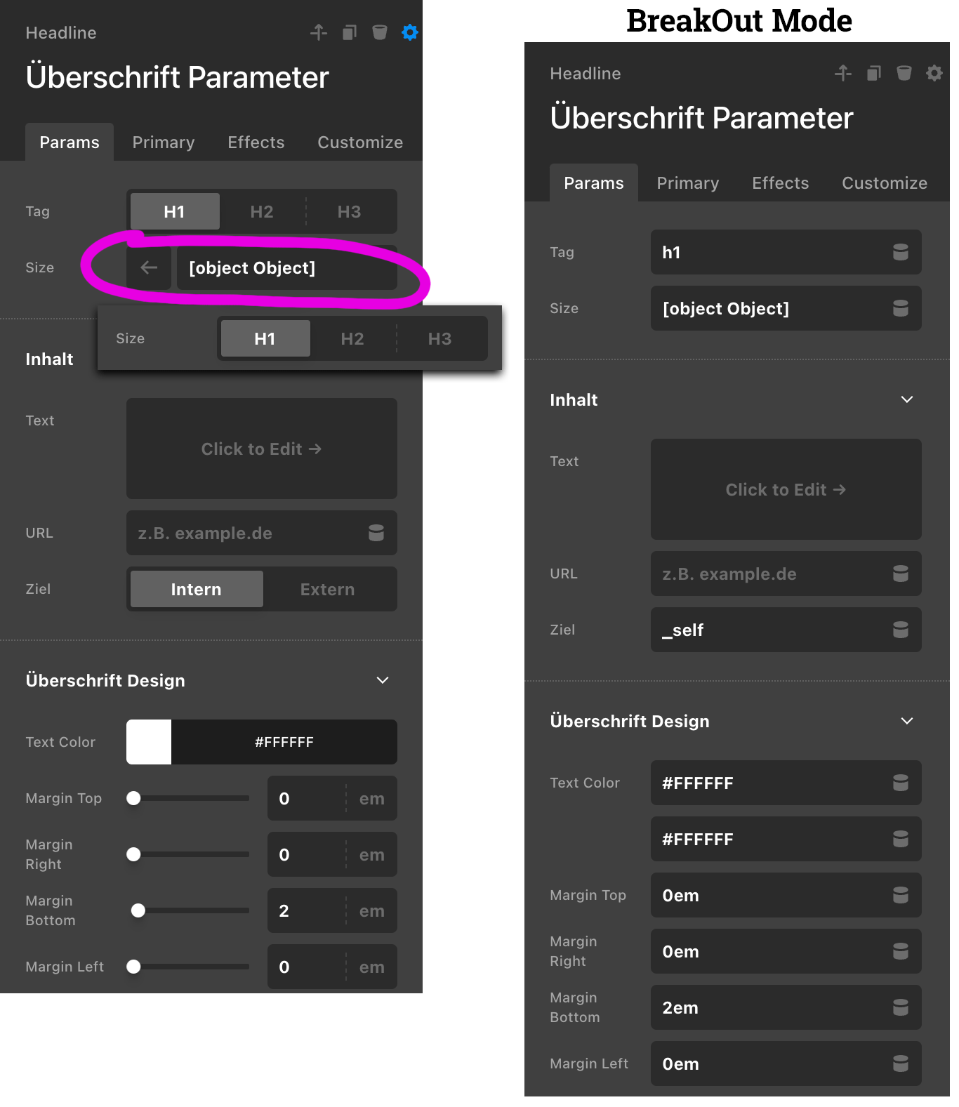 Hi, this is my parameter setting for headings. It shows what kind of heading, what appearance and a few other things. Everything works fine, but for the appearance the size field (look like H1, H2, H3…) is not displayed correctly. The “object Object” field is always displayed first with the arrow pointing to the left. As soon as I click on the arrow, I can choose and it’s displayed the way I want it. And it also works. But it’s a bit annoying in the workflow. Do I’ve a mistake in the parameter code or is there something I can improve?
