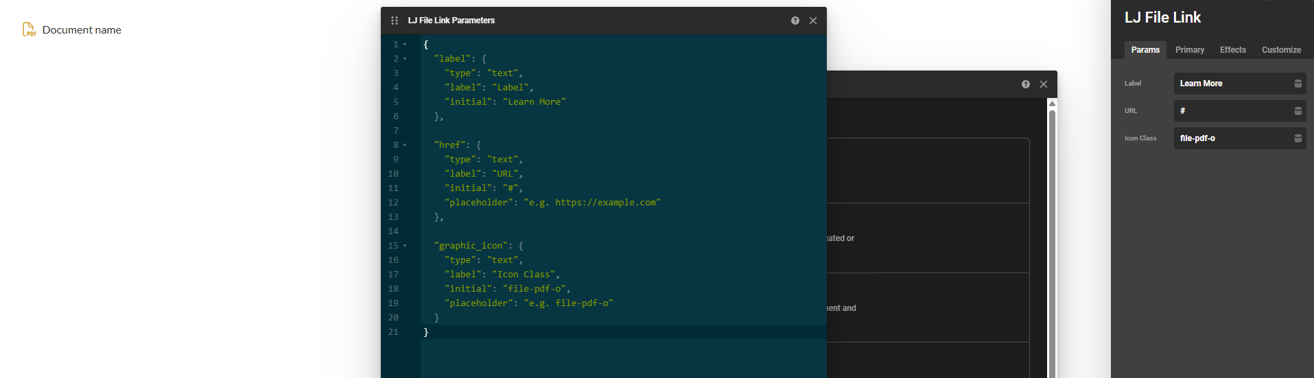 Hi guys. I hope you are all well. I am just wondering if this is possible. I have a headline that i have exported as a component and i have added some parameter code as i want my users to be able to change the title, add a url (this will be used for a link to files) and also i want them to be able to choose the graphic too. I have attached a screenshot of my json and screen. The json i have only lets them change the text for the graphic but it doesnt do anything and it would be nice for them to use the icon chooser. Hopefully this makes sense.