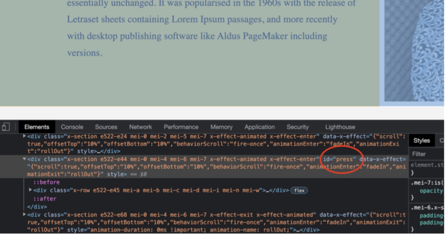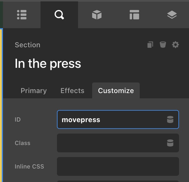 I am confused because when I inspect your homepage, I am seeing “press” as the ID of the section. When I edit the page in Cornerstone, I am not seeing that section. I only see a Section with “movepress” ID instead.