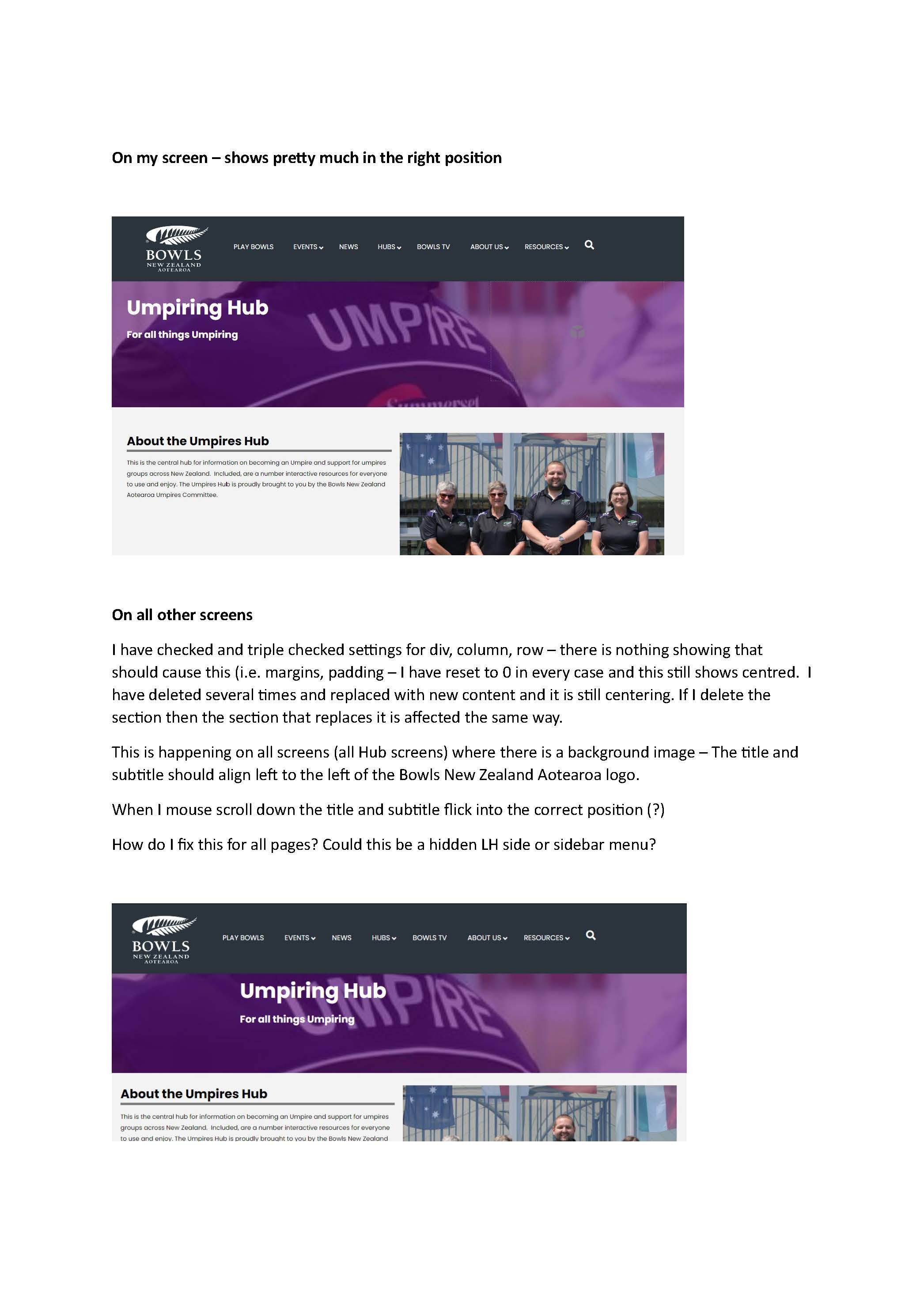I have three pages that all have images in the background - in the screenshots you can see that on my screen the headings align correctly but when we are looking at the same page on other screens it is aliging under the Y in the play bowls. They both correct to the right position when I scroll my mouse down.
