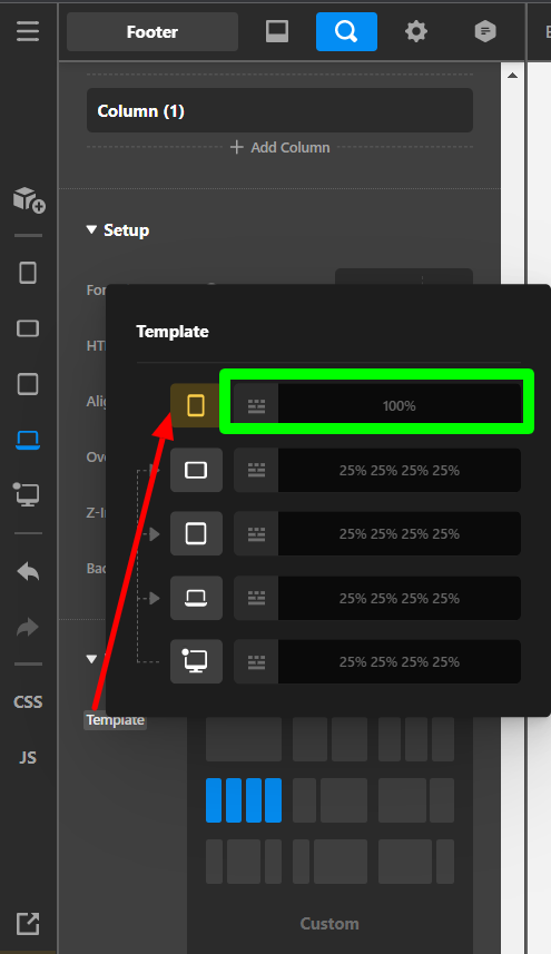 I am trying to change the layout of the columns on the footer depending on the size of the screen. I switch to the screen size and change the layout, and it changes it for all sizes. Please help.