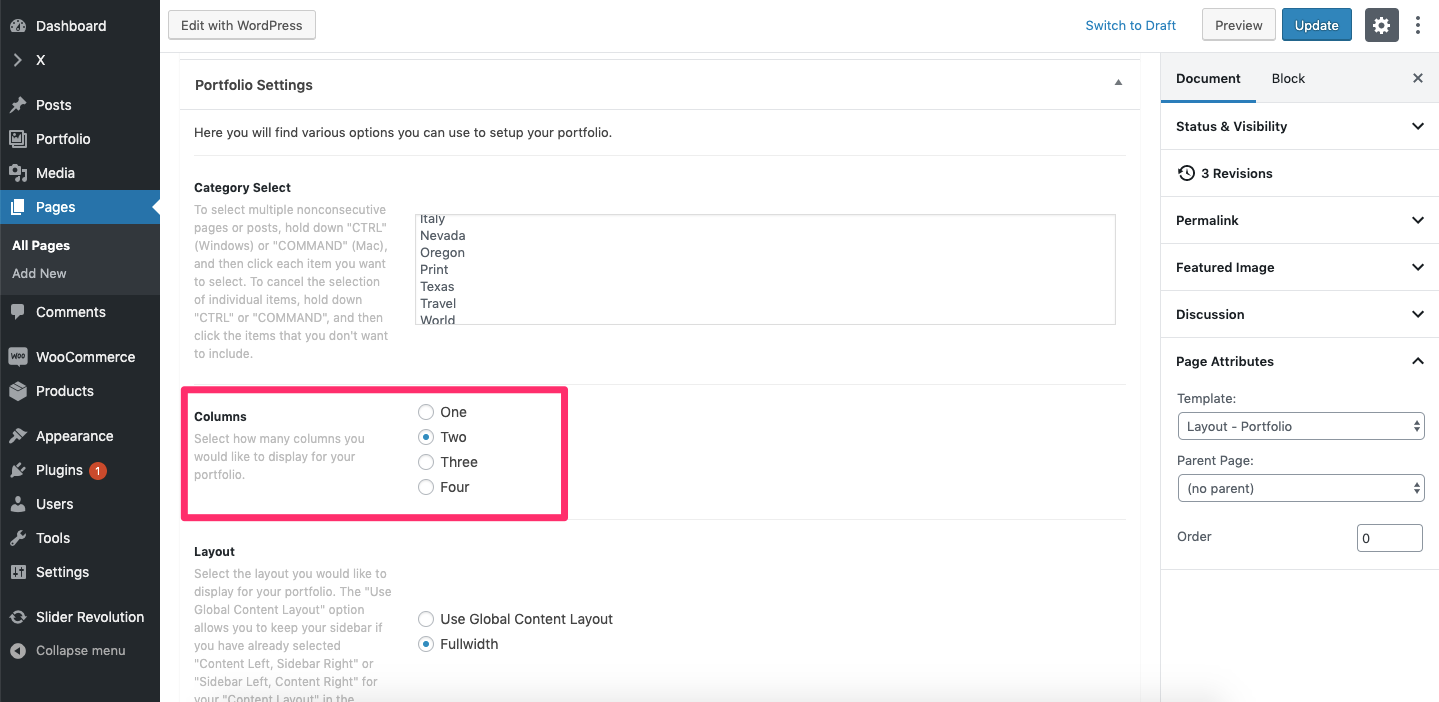 On the main portfolio page that shows all posts, is there a way of selecting how many columns you want there to be?