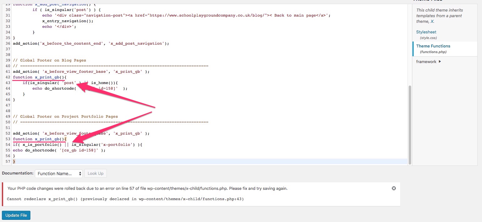 I’ve added in a global block of the footer to the Blog pages (which you previously gave me for a different website) but now I’d like to have the global block footer on the Portfolio pages too if that’s possible (both on the main and single portfolio pages). I can’t figure out from the code you gave me for the Blog how to do it for the Portfolio as I’d hoped it was just a case of swapping ‘Blog’ for ‘Portfolio’ but it doesn’t appear in the code! This is the code I’m using: