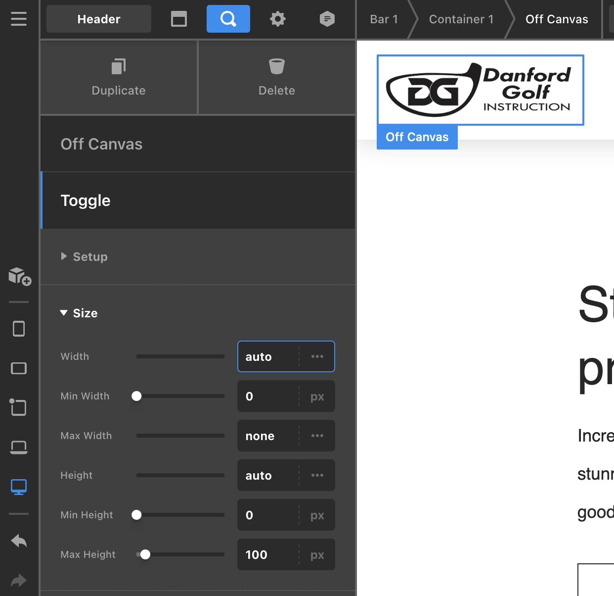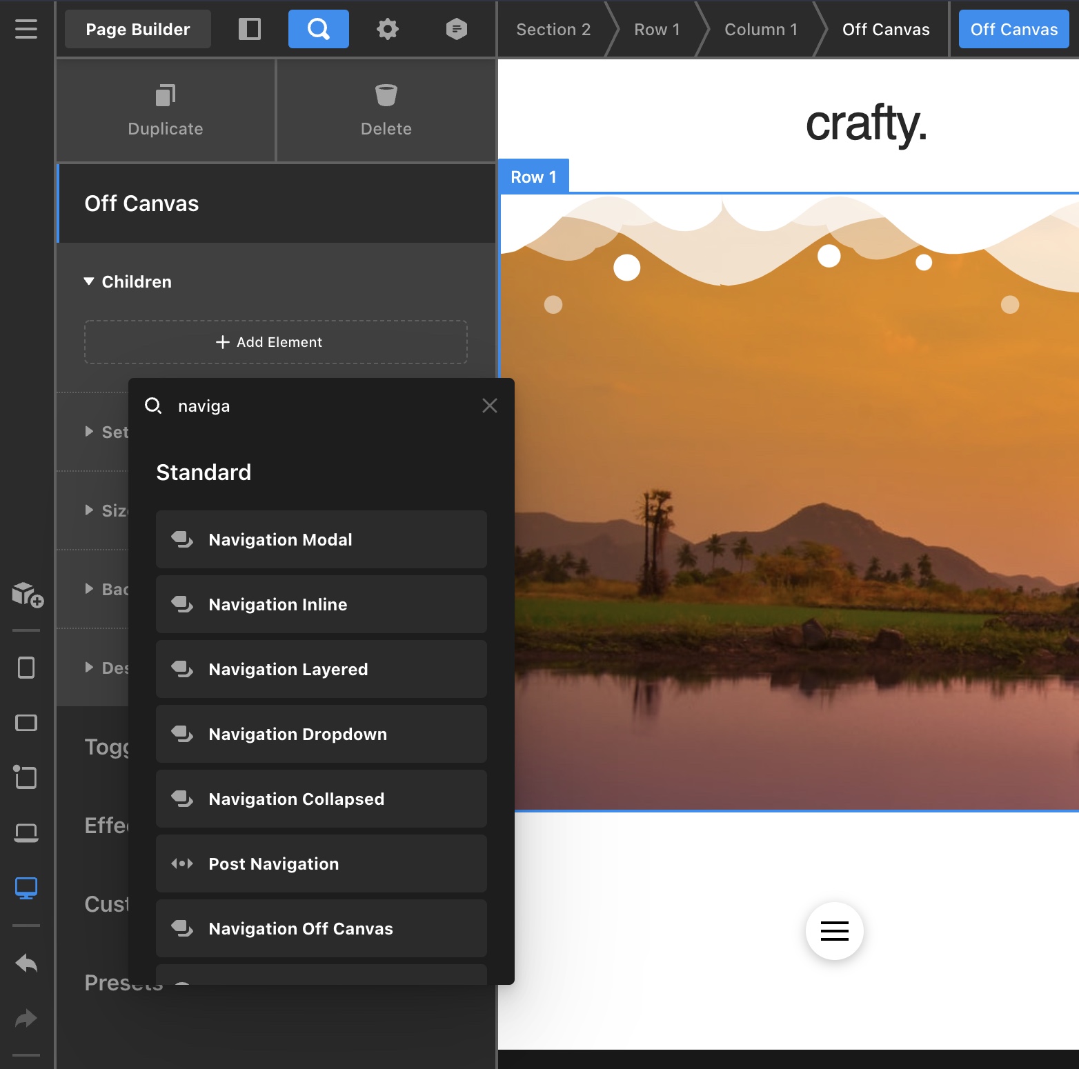 With the Off Canvas element, you can easily insert any element you want. It can be an Image element for a logo or the Navigation Inline element to display a menu.