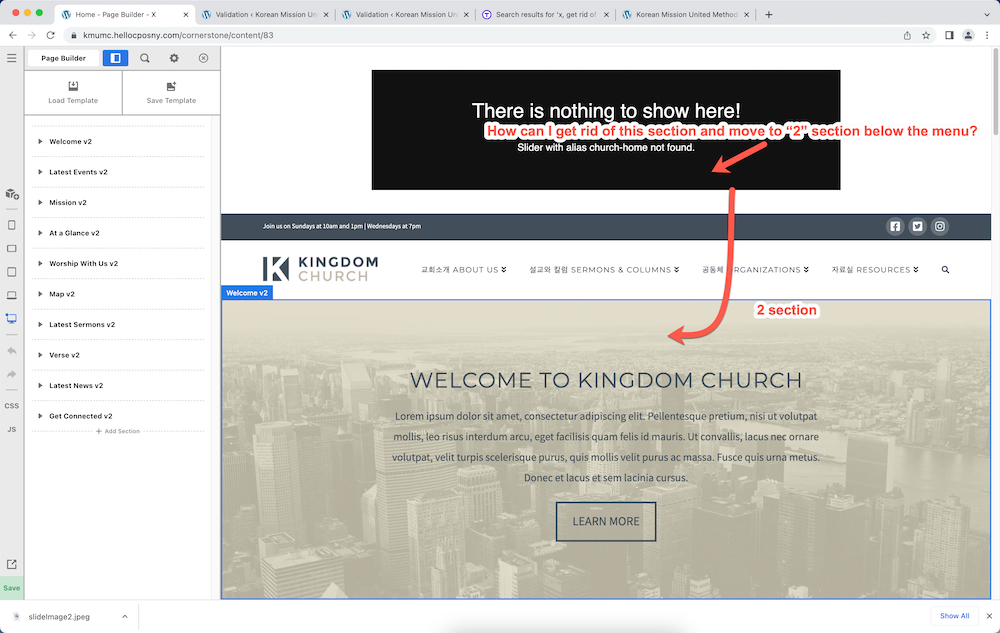Hello. I just installed one of theme called “church” from theme cloud. I cannot get rid of “slider revolution” on the top of the homepage. In addtion, cornerstone does not allow or does not have a function to add “slider revolution” under the menu. How can I get rid of “slider revolution” on the top and move down to the area under the menu? Thanks for your help.