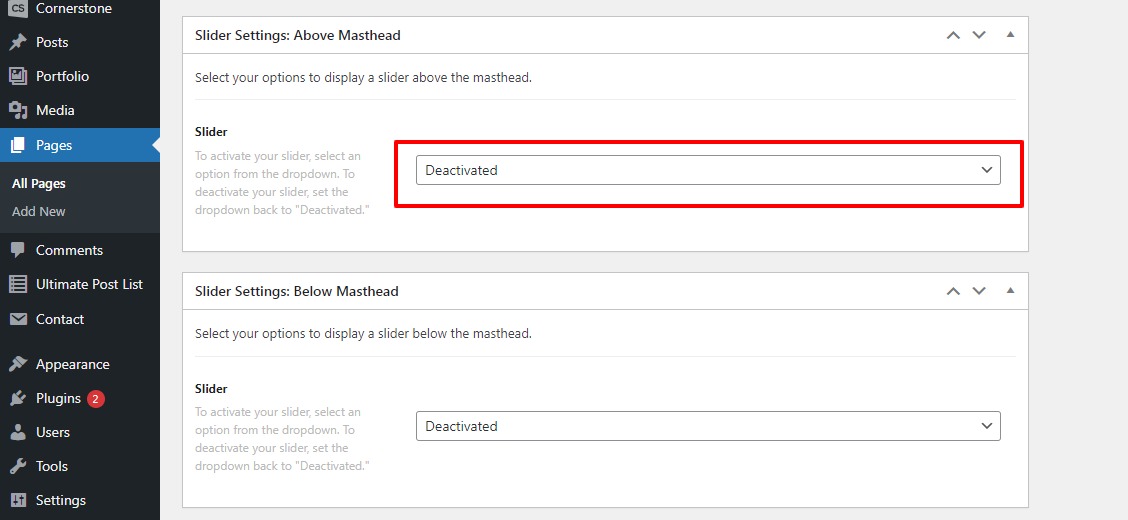 In order to remove the revolution sider from the Header you need to go to the Pages–>Home—>Click on the “Edit” button —>Pagge Settings, you need to select Deactivate from here.