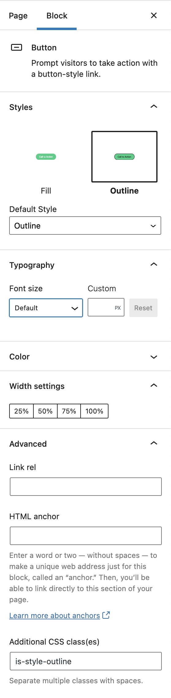 Unfortunately, there is no such option to style the Button in the Default block editor. But you can do that by adding the CSS class into Additional CSS Class(es) as mentioned in the given screenshot.