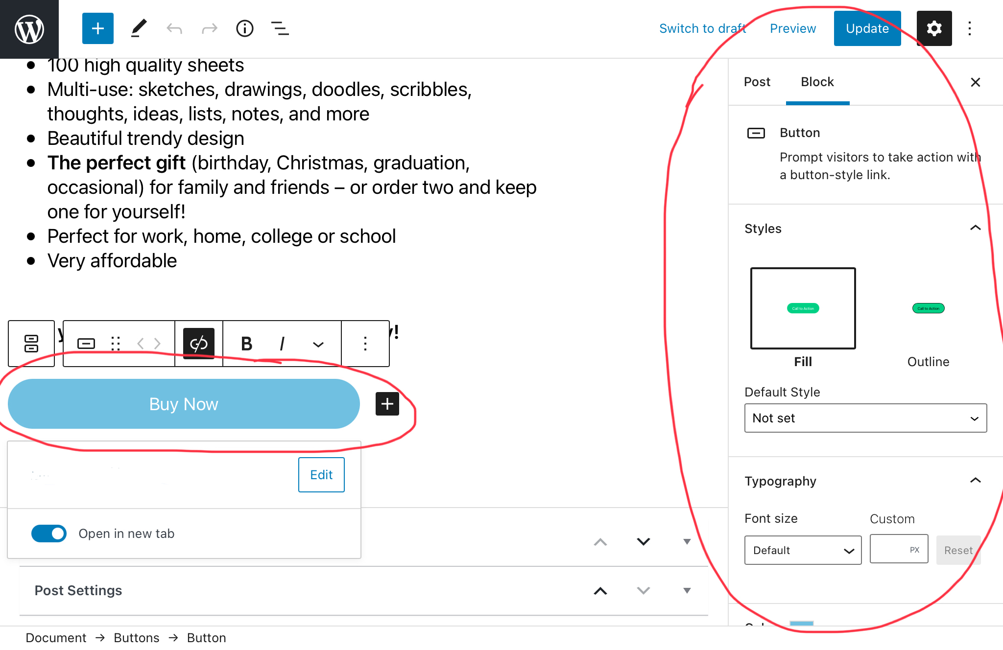 Hi there. Am I able to customise the button on the Post pages to match the other buttons on my site? The button settings within the Post page appear to be very restrictive? The first image attached shows the button options when creating a post, and the second image shows how the button appears on my site (and shows the button style I would like to replicate).