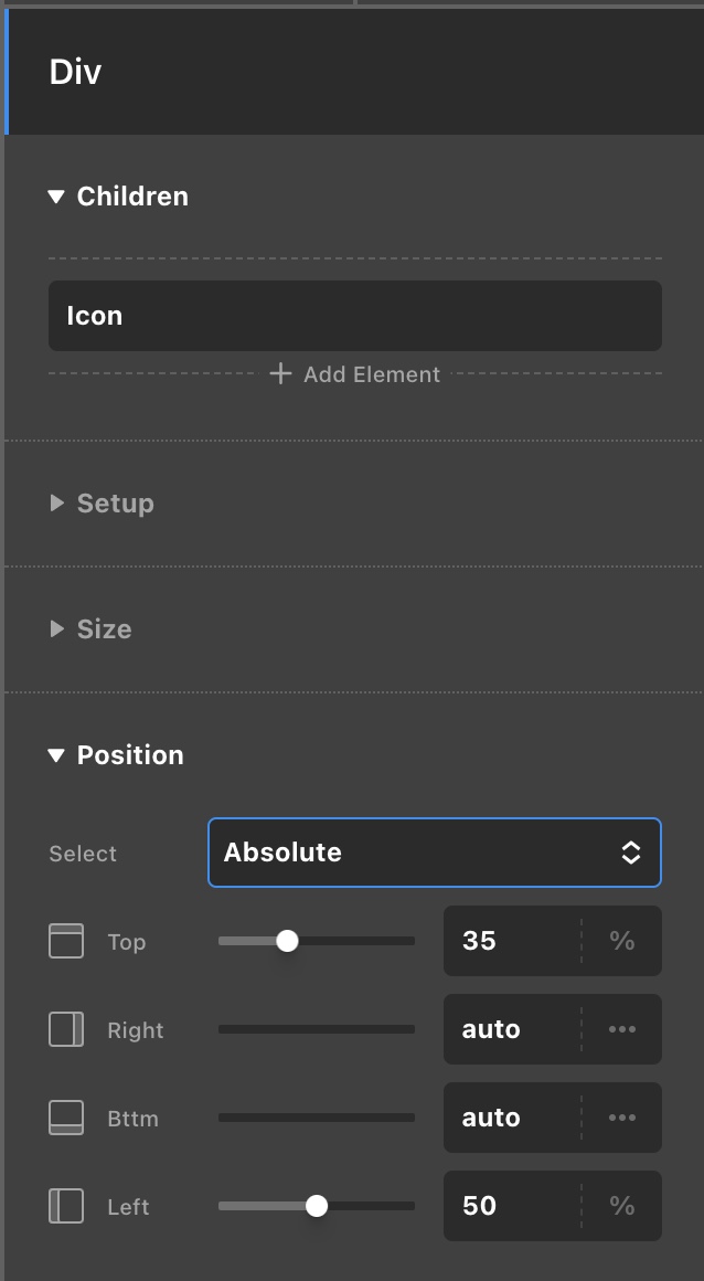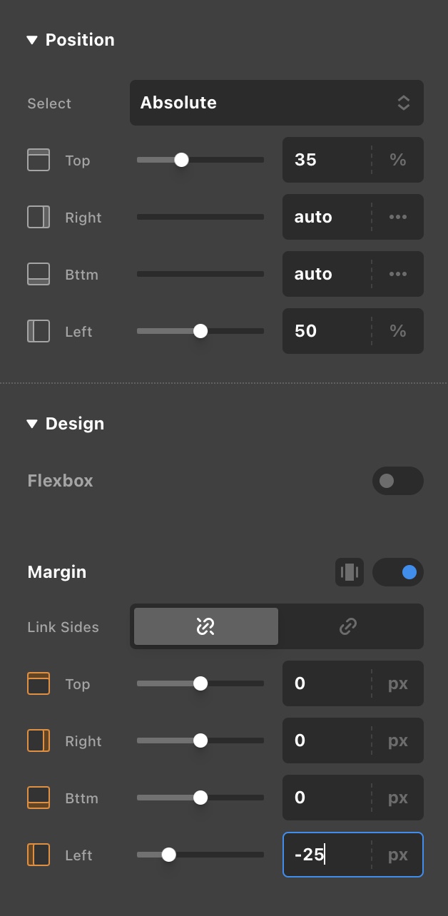 5.) In your second DIV element, set the Position to absolute while adding the 35% top value and 50% left value.