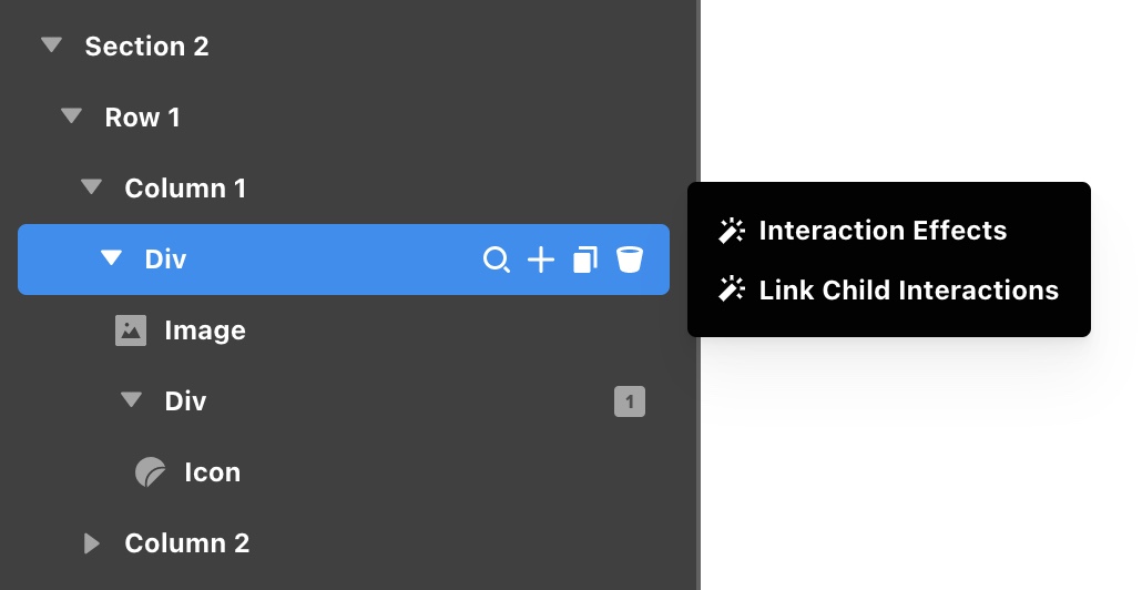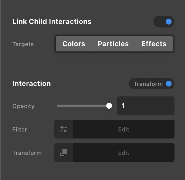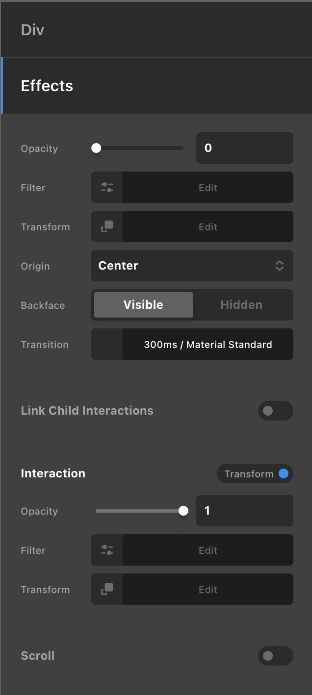 9.) Now, click the first DIV element and go to the Effects setting. You will need to enable the “Link Child Interactions” and set the Interaction to “Transform”.