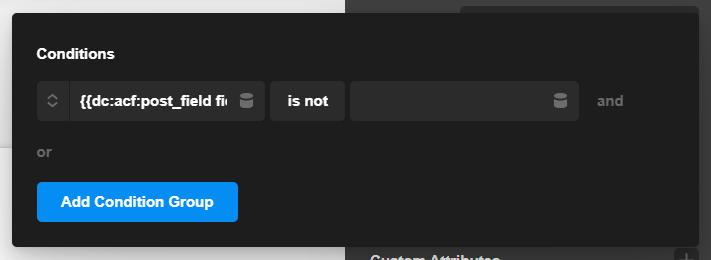 You need to use the {{dc:acf:post_field field=“home_brief_youtube_line”}} in the condition and check if that is blank or not. Please find the screenshot describing the condition.