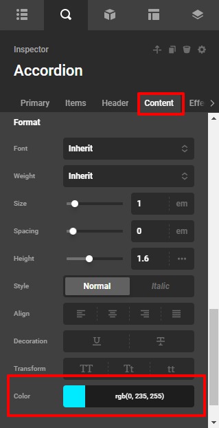You can also change the accordion header text color by going to the accordion Header tab. In case you have not seen the doc of the accordion please have a look at it.