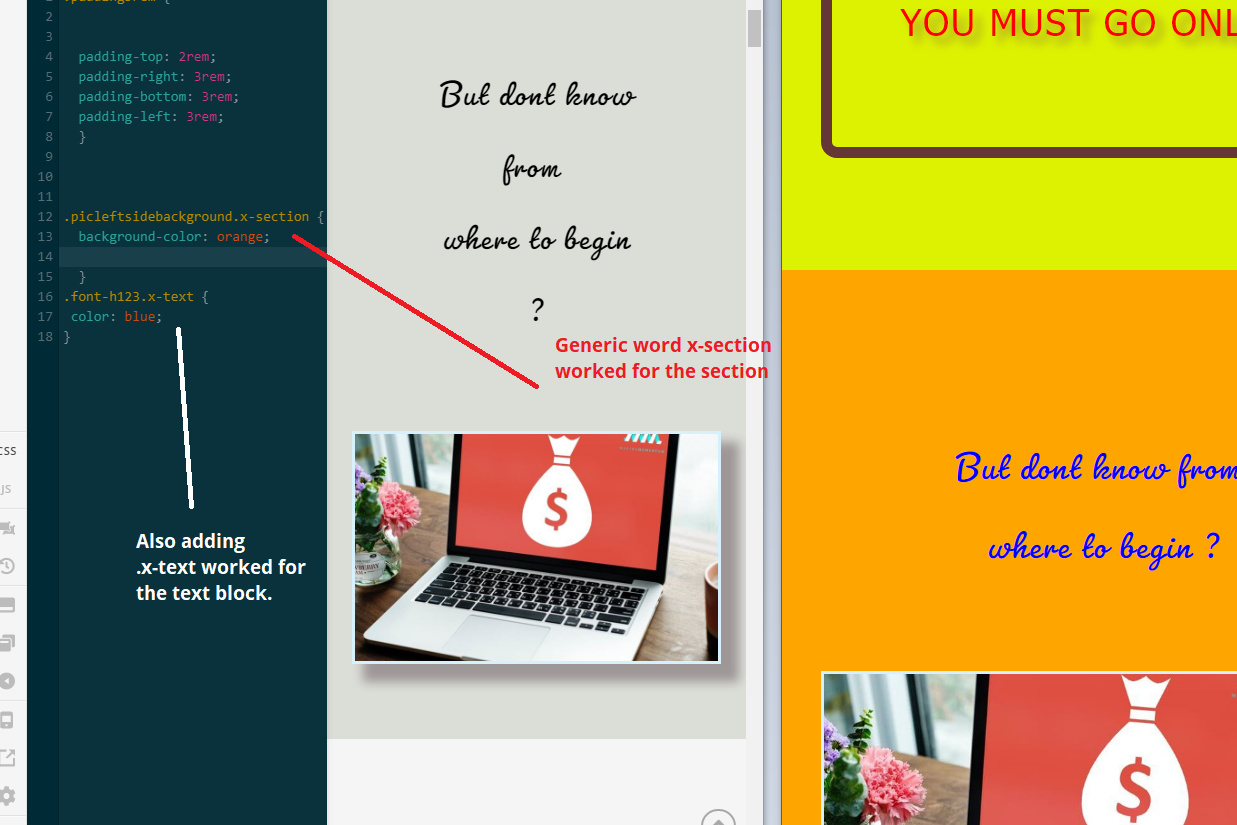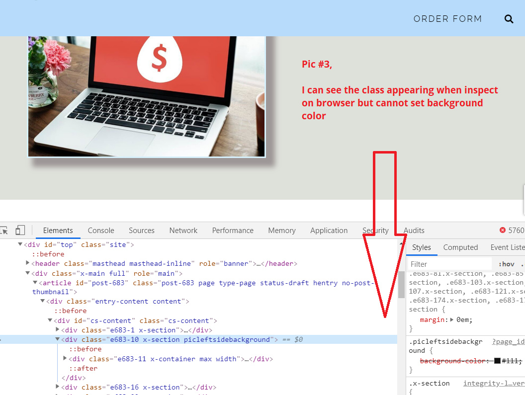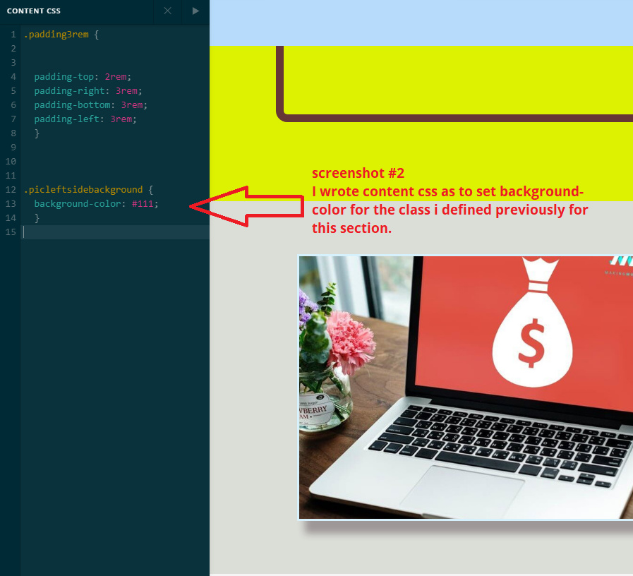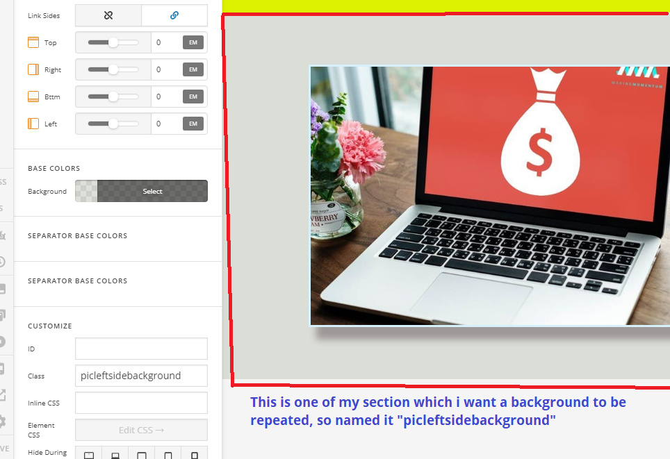 Pls see the first picture below where i named one of my section as “picleftsidebackground”, The reason to name class is to use the same settings for some more sections later in the page.