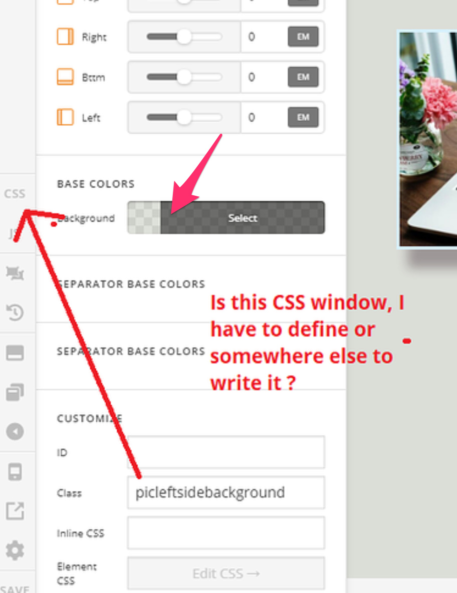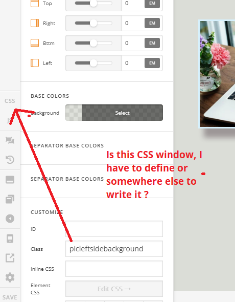 Instead of CLASS if I define this in ID tab, and writing as #picleftside… it works. But because I want to define as class what is the solution. Please can you help me to use the class extensively so that I hv not to repeat those settings. I know i can copy template or duplicate but that not helps my purpose as when i want to change the background later, for all the sections where I used this CLASS, i will simply change in css window.