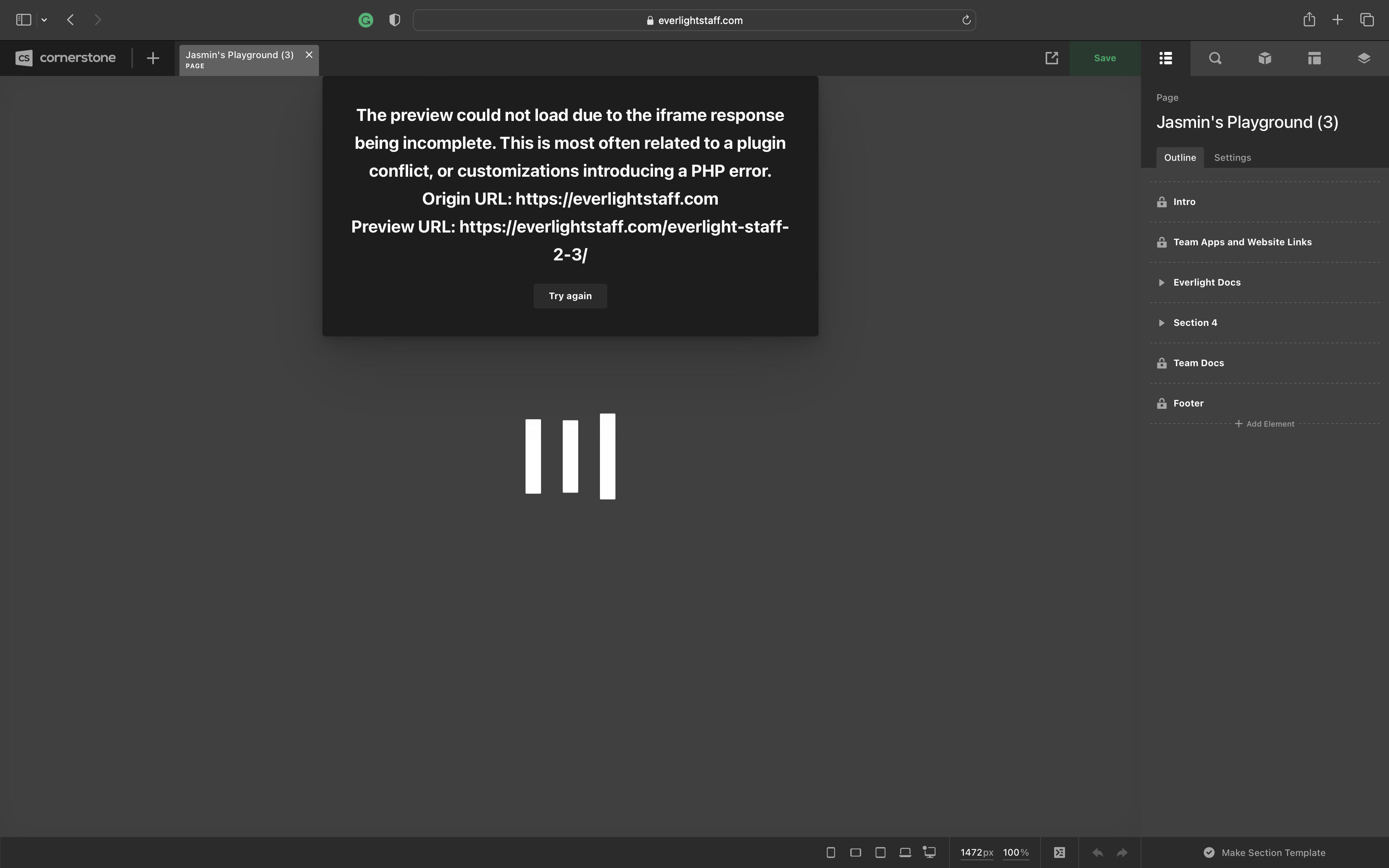 We have tested every forum solution listed and are still at a loss - We are receiving this error each time we try to select “Edit with Cornerstone” within our pages that we’ve created within WordPress.