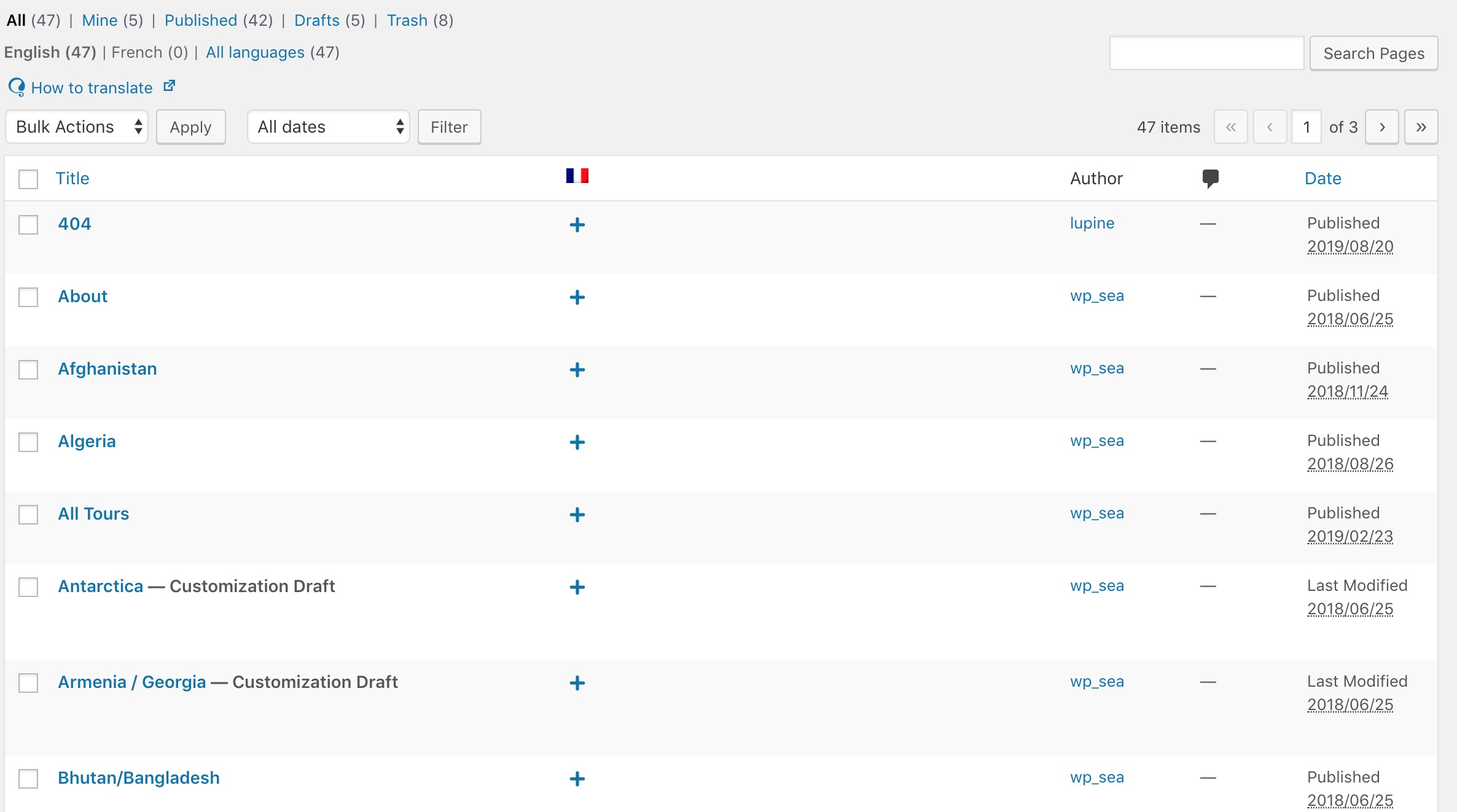 This is the reason why there is no About page when you switch to French (Question #1, (see about1 and about2)). Hence it’s not an issue, it’s just that there is no translations for old or newly added page. They did not disappear, you haven’t yet provided a translation so there is nothing to list on French listing.