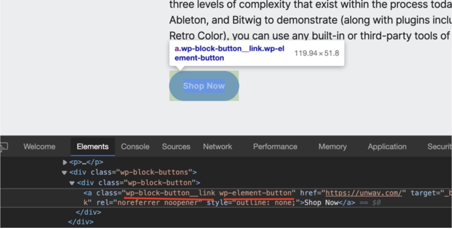 If you inspect your Button, it has wp-block-button__link and wp-element-button class attached to it.