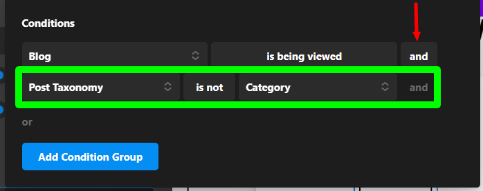 You need to add another condition to check for the Post Taxonomy is not the Category as shown in the given screenshot.