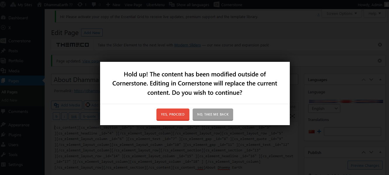 It seems that the existing Cornerstone content has been modified in the Block editor and that is the cause of the issue. Regretfully, the content added through the Cornerstone editor is not editable in the Block or Gutenberg editor, and vise-versa. That’s why the edited content is not showing in the Cornerstone.