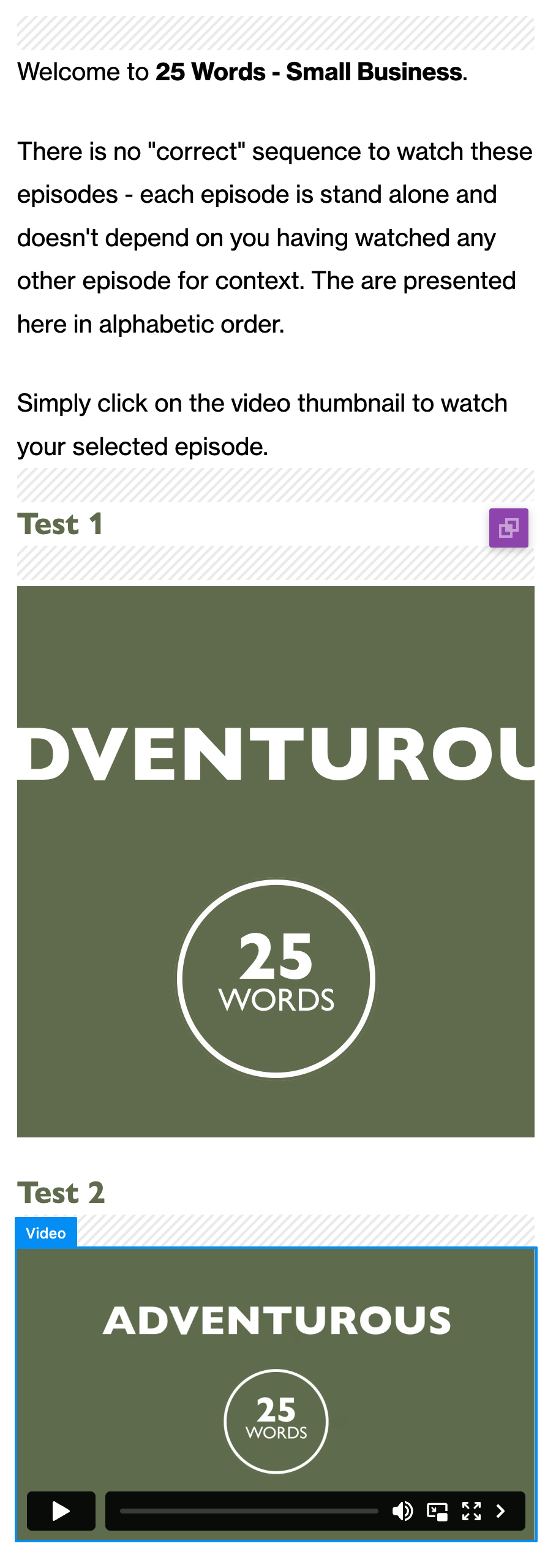 In the attached images, you’ll see the modal in the column marked Test 1 and the video added as a video element directly into the cell in Test 2.