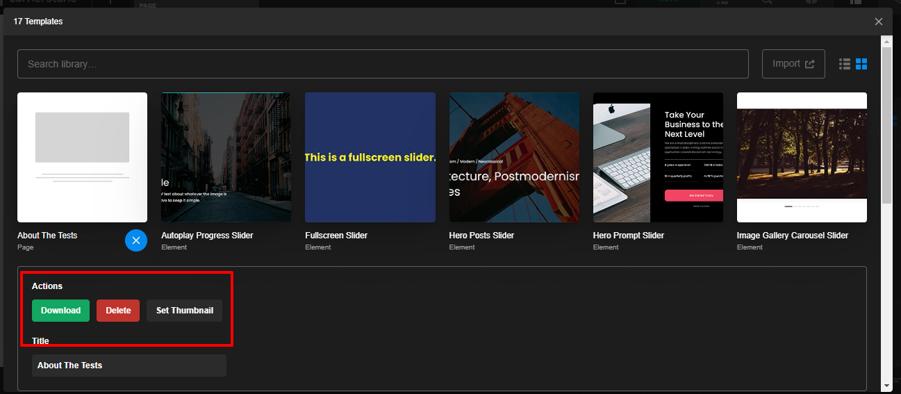 In order to get the Template library I would suggest you go to any page edit with the Cornerstone —>Clcik on the Template Icons—>Manage library