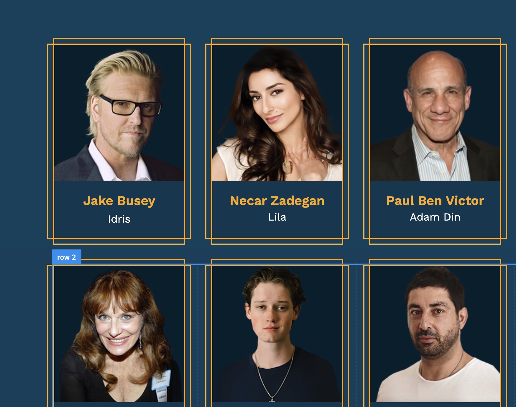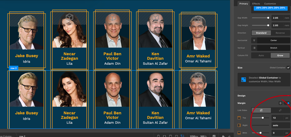 You have Row1 and Row2 to display the cast members. In your Row element settings, you have 2.85rem gap width for each column.