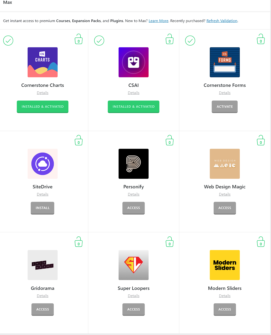 I can Install/Activate the first 4 features, but when I try to Access any of the others my access is locked - for example, I can’t get to Personify, and I can’t even get to Charts even though it’s already installed/activated: