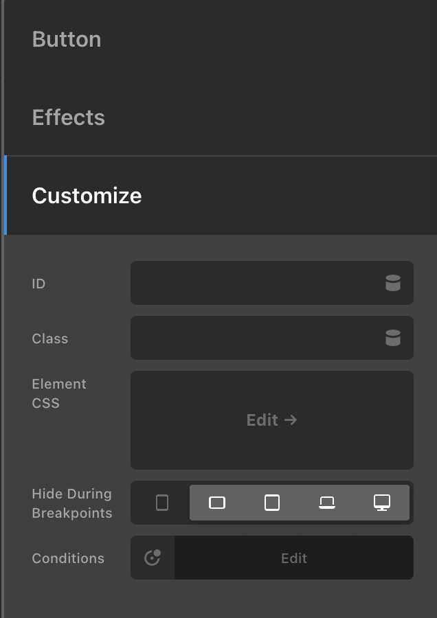 The Button element which displays the User icon is hidden away and only visible on smaller screens. You can easily know that because of the note that the “Hide During Breakpoints” option has been applied to the element. If you look closely in the Customize tab of the Button element settings, you will see this: