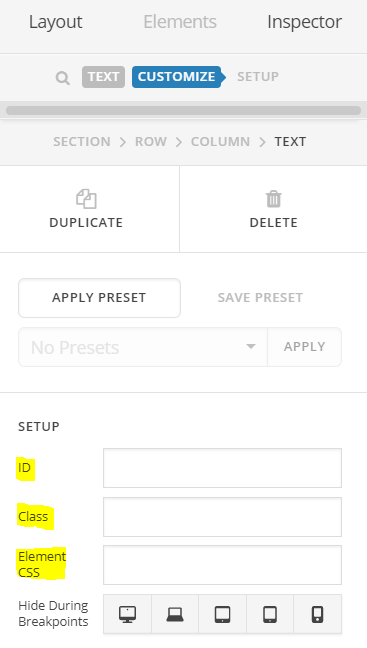 I’ve set a responsive text settings, but my problem is that in my text element, I don’t have the id, class or style options and I have no idea why.
