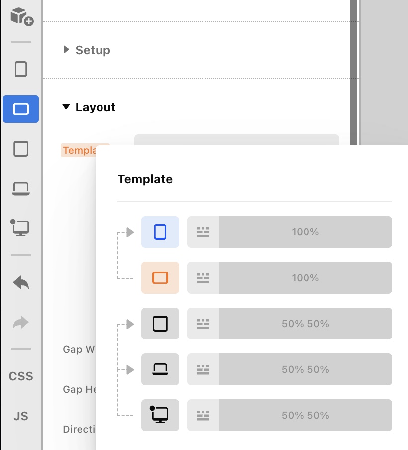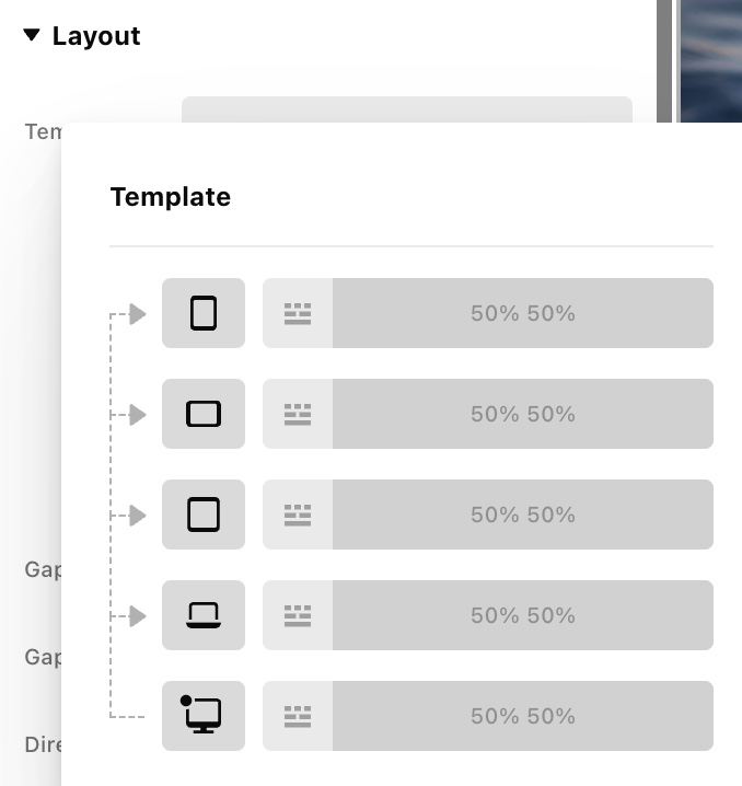 You have the issue because you only set 50% + 50% column layout for all screen sizes in your Row > Layout > Template element settings.