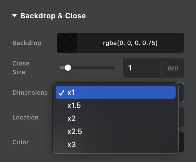 You may also need to adjust the dimensions of the Backdrop and Close button: