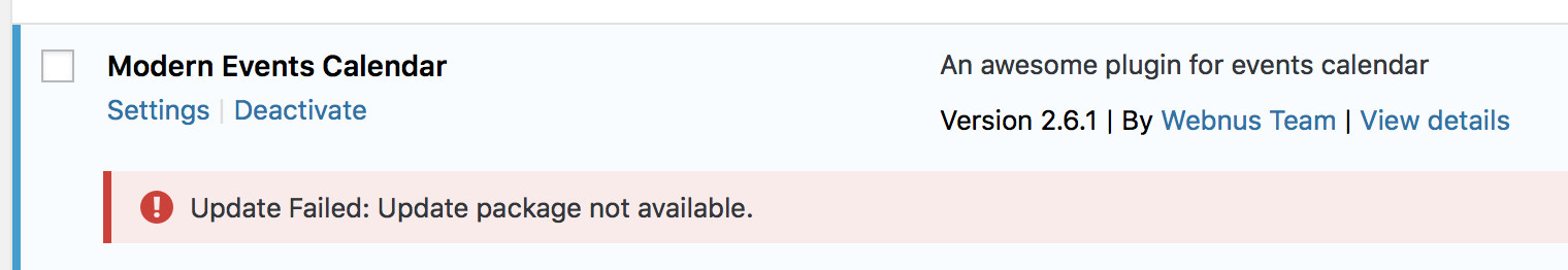 There is a known problem with ME Calendar 2.6.1 where carousel setups are not automating as they should. Apparently this is addressed in version 2.6.2 which is just released. However, when I try to update, there is a message that says…There is a new version of Modern Events Calendar available. View version 2.6.2 details. Automatic update is unavailable for this plugin.