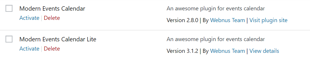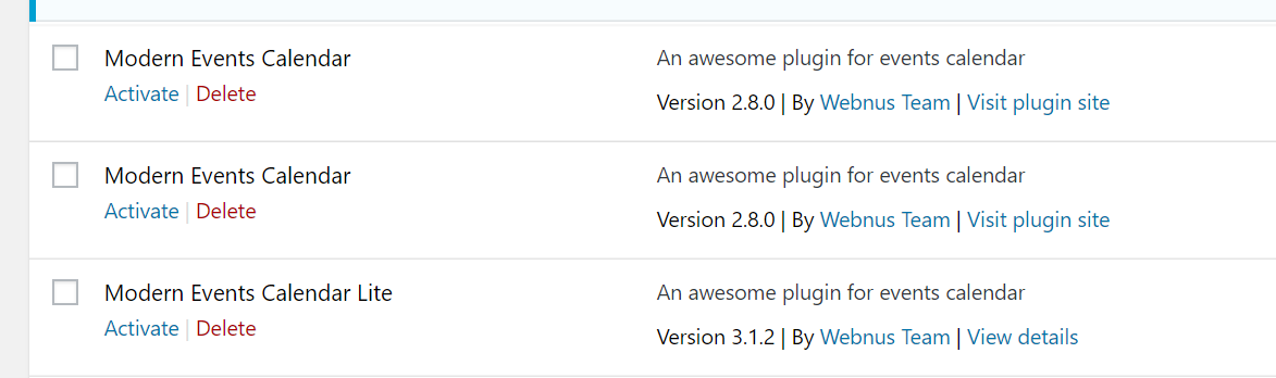 Thanks for writing in! It is best that you delete both plugins first before re installing it. You will need to delete it manually to avoid corrupting your MEC events already added in the site. Please log in to your FTP and browse to the plugins folder wp-content/plugins/. You must delete all the MEC events plugin folder. When you re install it, simply go to X > Validation > Extensions and select the MEC plugin to install.